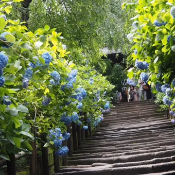 参道をブルーに染める紫陽花は朝日を浴びて美しい︎!