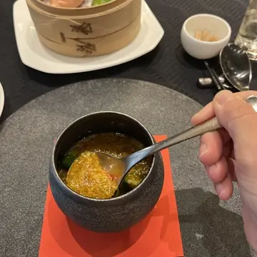 冬瓜とフカヒレのスープ。実は夏野菜の水々しい冬瓜ととろっとしたフカヒレスープがたまらない美味しさ