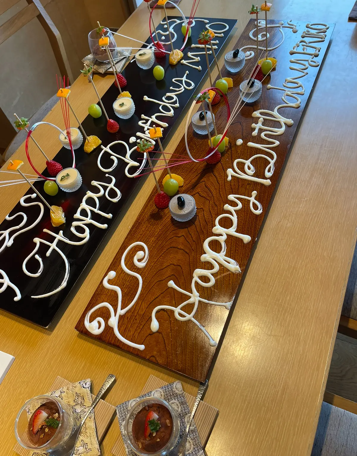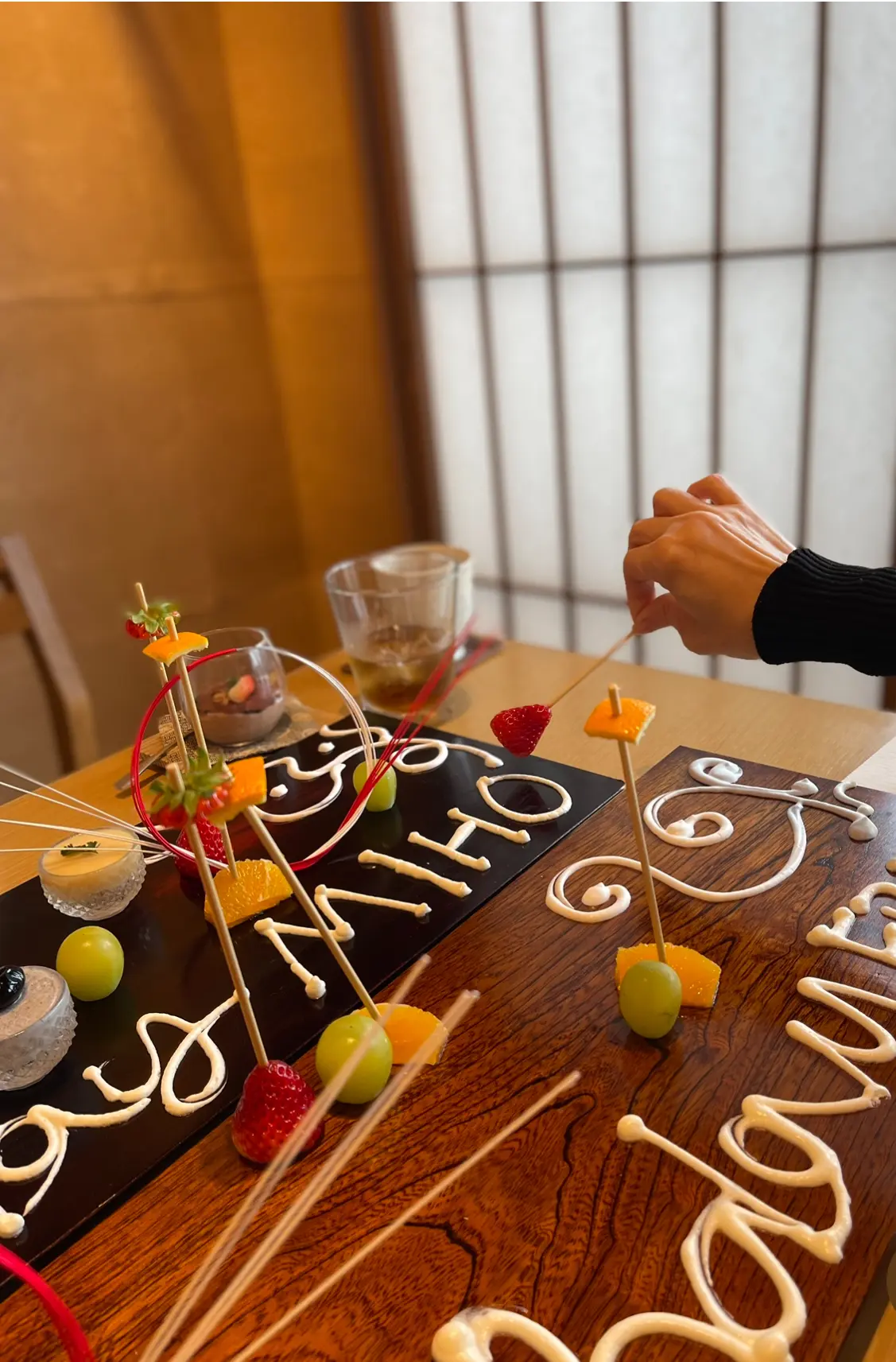 生クリームで描かれたダイナミックなメッセージにフルーツをつけて食べるとこれまた美味しい!