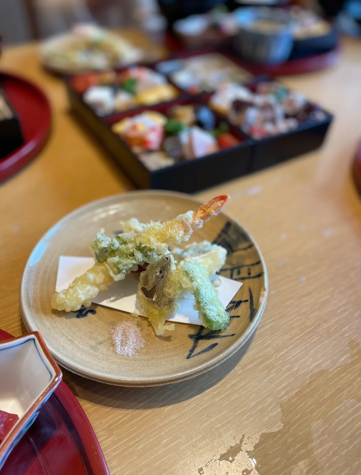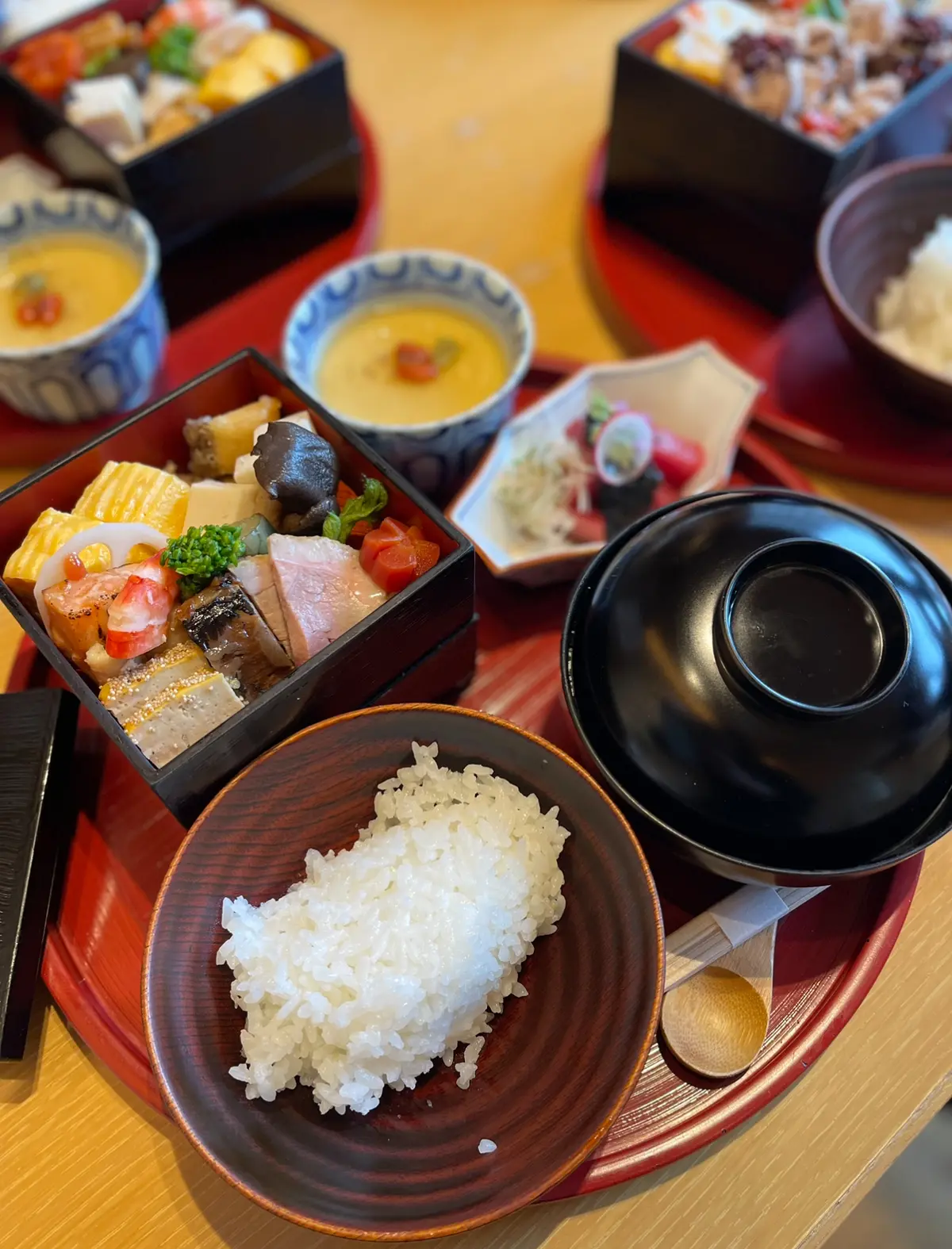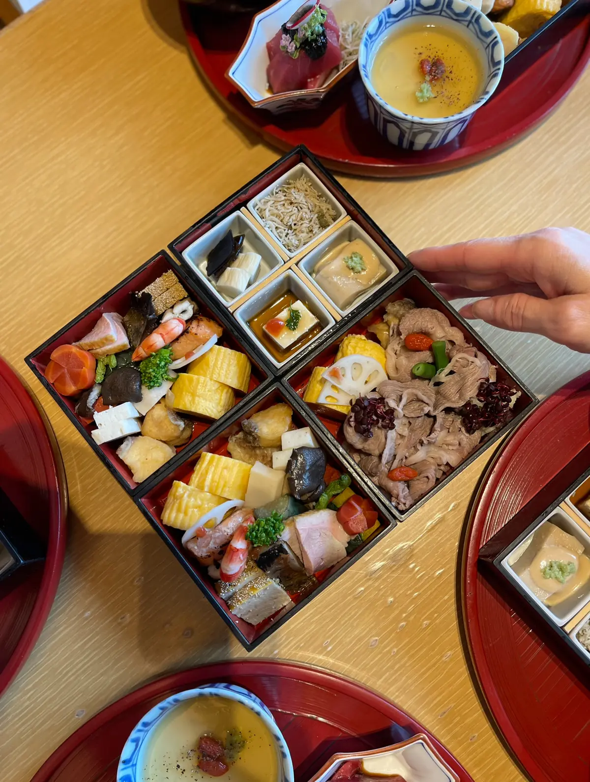 京都割烹のお弁当は二段のお重、茶碗蒸し、お刺身、揚げたての天ぷら、ご飯、お味噌汁、デザートもついてお腹いっぱい。こちらで¥5,000以下という高コスパにも驚きです✨