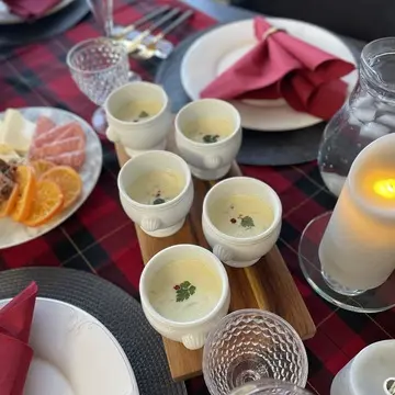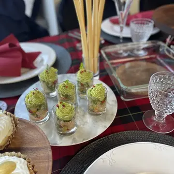 友人とのクリスマスパーティーのテーブルコーディネートも赤。タータンチェック柄のクロスを斜めにしき、ナプキンを赤に。
