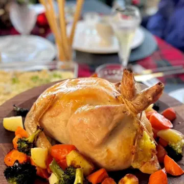 ターメリックライスを詰めた丸鶏のオーブン焼き、シーフードとアボカドの前菜、チーズプレート、クラムチャウダーを用意。