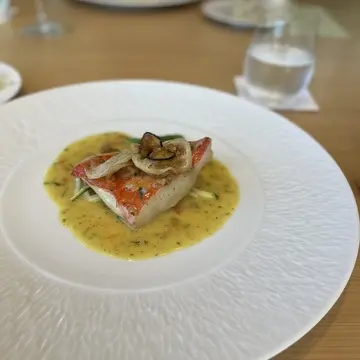 金目鯛のブレゼ エキゾチックなマリニエール、静岡産ズッキーニのジェリエンヌ、伊豆高原白茄子のチップス
