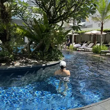 ホテルの2階に位置する宿泊者専用のガーデンプールは、都会の喧騒を忘れさせてくれるリゾートのような空間✨高層ビルに囲まれながらも、緑豊かなガーデンと水音に包まれてとてもリラックスできます。