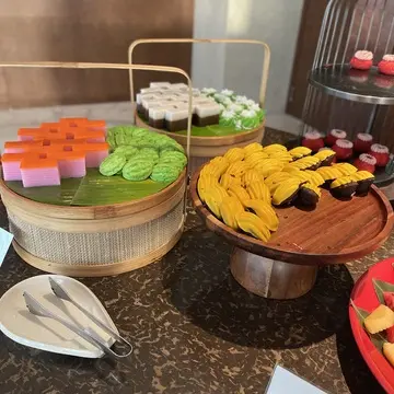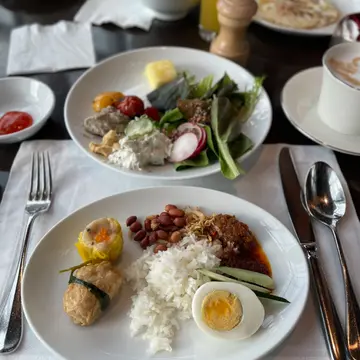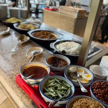 ココナッツミルクで炊いたご飯にサンバル (唐辛子とエビペーストの辛いソース)、揚げ小魚、ピーナッツ、ゆで卵 or 目玉焼き、きゅうりのスライスをワンプレートにして頂く朝ごはんの定番メニューだそうで、ピーナッツがいいアクセントになり、クセになる美味しさ😍