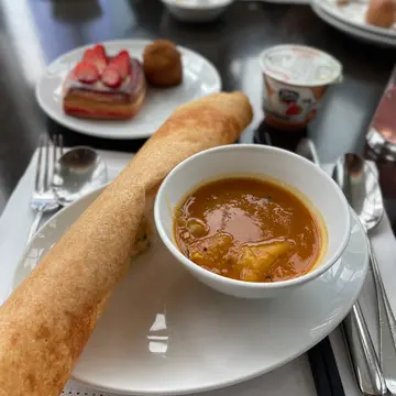 目の前でシェフが焼いてくれる「ロティ・ティシュー」と呼ばれるパリパリの薄い生地と一緒に頂くカレーも絶品でした。