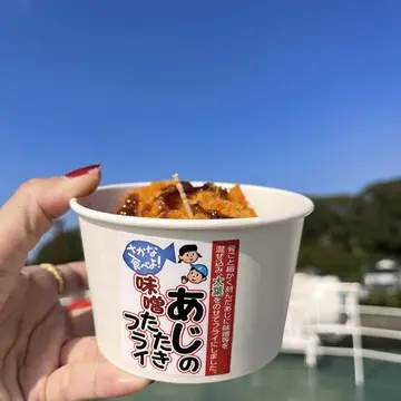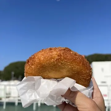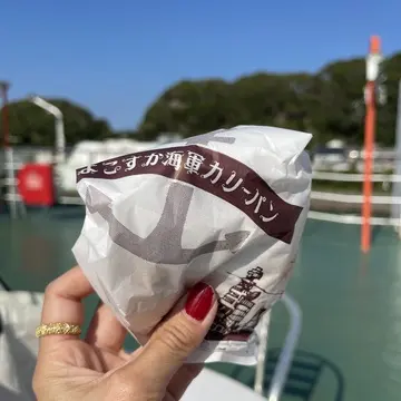 船内の売店で購入した「よこすか海軍カリーパン」と「あじの味噌たたきフライ」を風に吹かれながらデッキで頂きました。