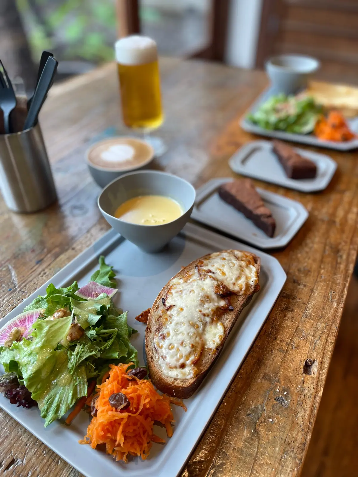 店内のベーカリーで焼き上げた焼きたてのパンに具材が贅沢にのったタルティーヌにサラダ、日替わりのスープ、デザートがついています。量も丁度良く美味しかったー♪