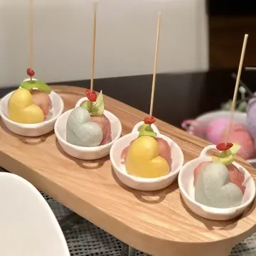 ハート型のモナカ「モナロン」。 ポテトサラダに生ハムを巻いたものに添えました。 ピックには春野菜のうるい、クコの実を刺して。
