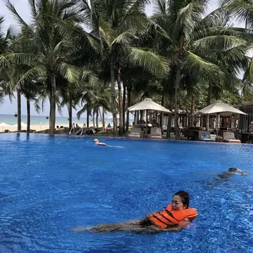 プールの足のつかない深さのところで溺れそうになってしまい、ライフジャケットを借りてプカプカ😂