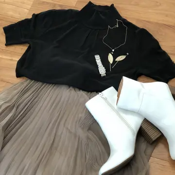 ベージュをメインカラーにしたので、ホワイトブーツでプラスのアクセントに♪