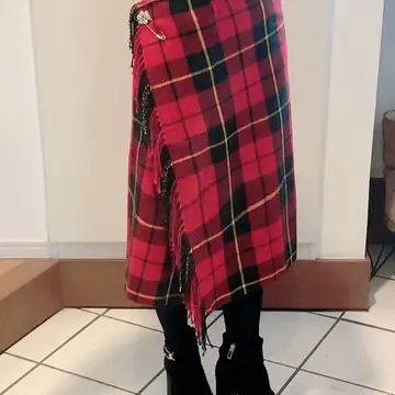 こちらはピンクの大判カシミヤストールを羽織って上品に。
