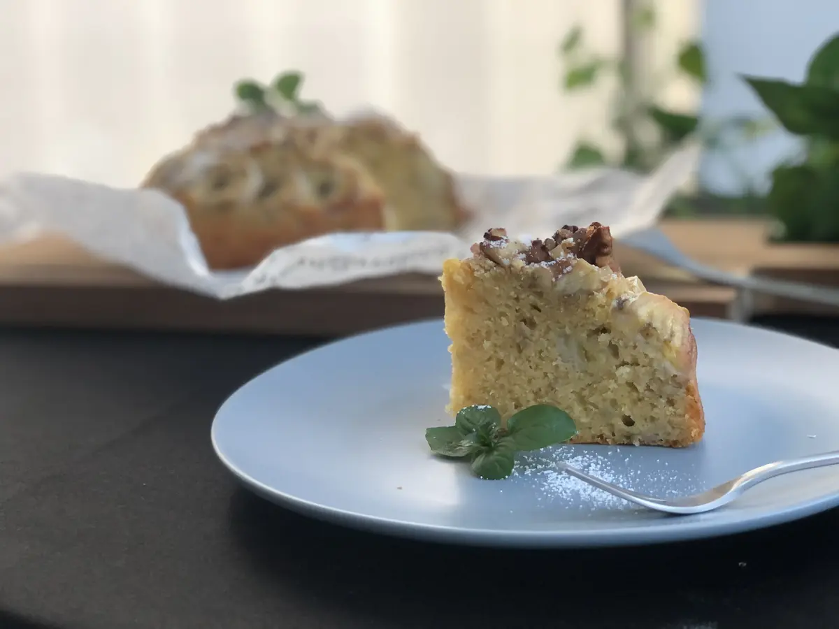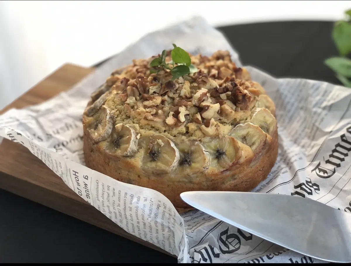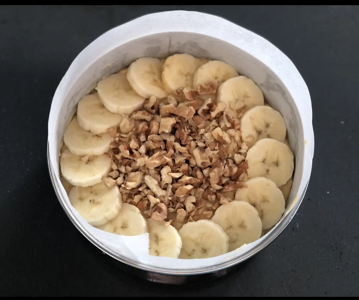 ⑤生地を型に流し入れ、5ミリの厚さに切ったバナナ、粗く刻んだクルミを乗せる