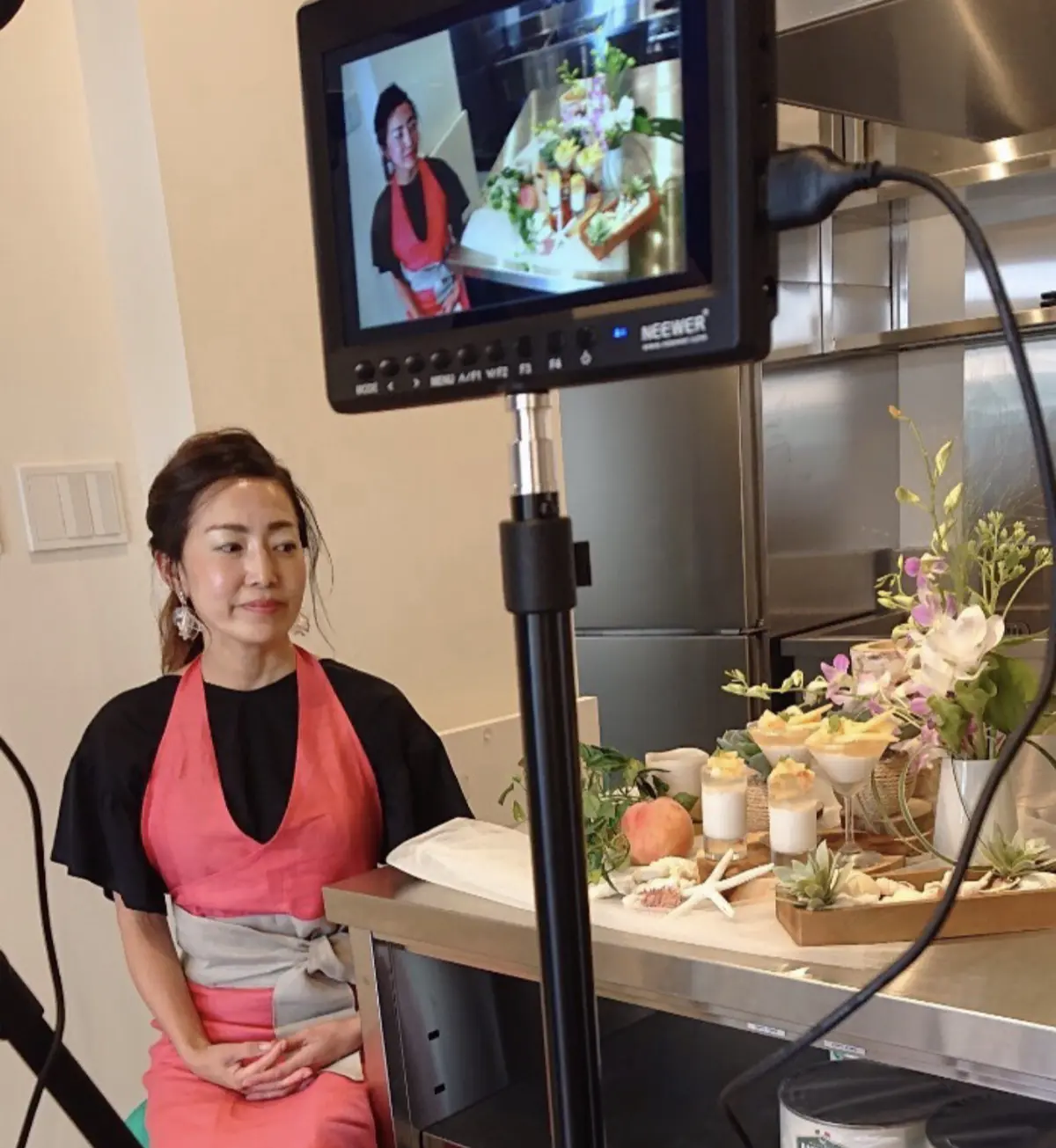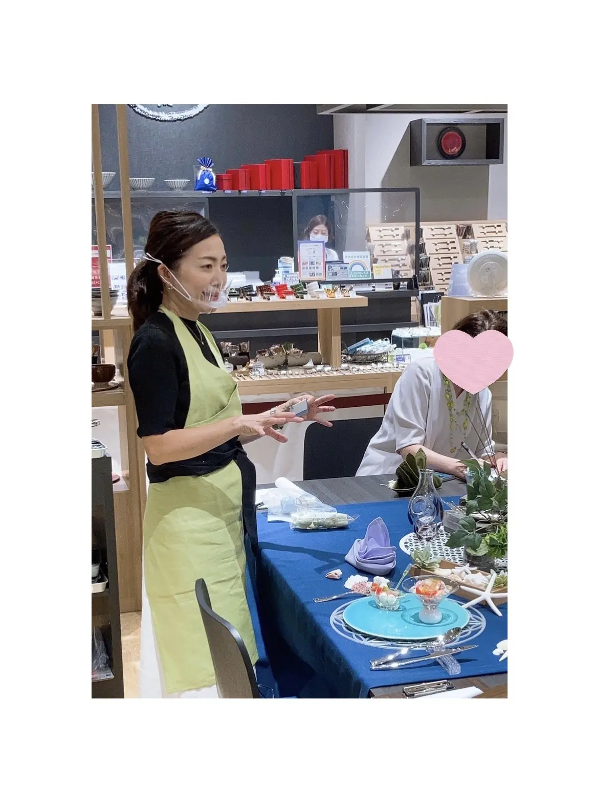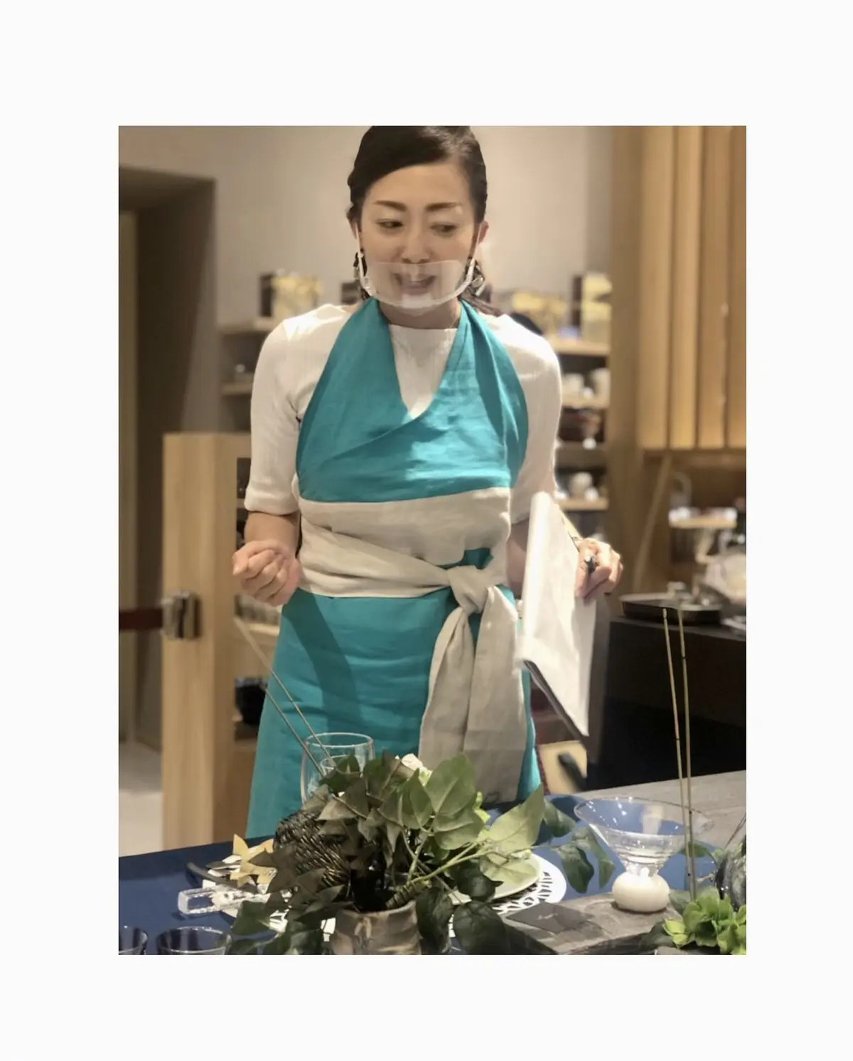レッスンの時の服装は動き易くて極力シンプルなものを心がけているので、テーマや季節に合わせてエプロンで華やかさをプラスしています。