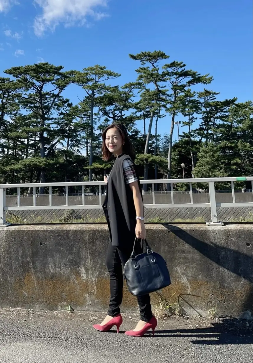 ボリュームのあるポワン袖ブラウス、ブラックスキニー、インポートバッグ、赤のパンプス。
