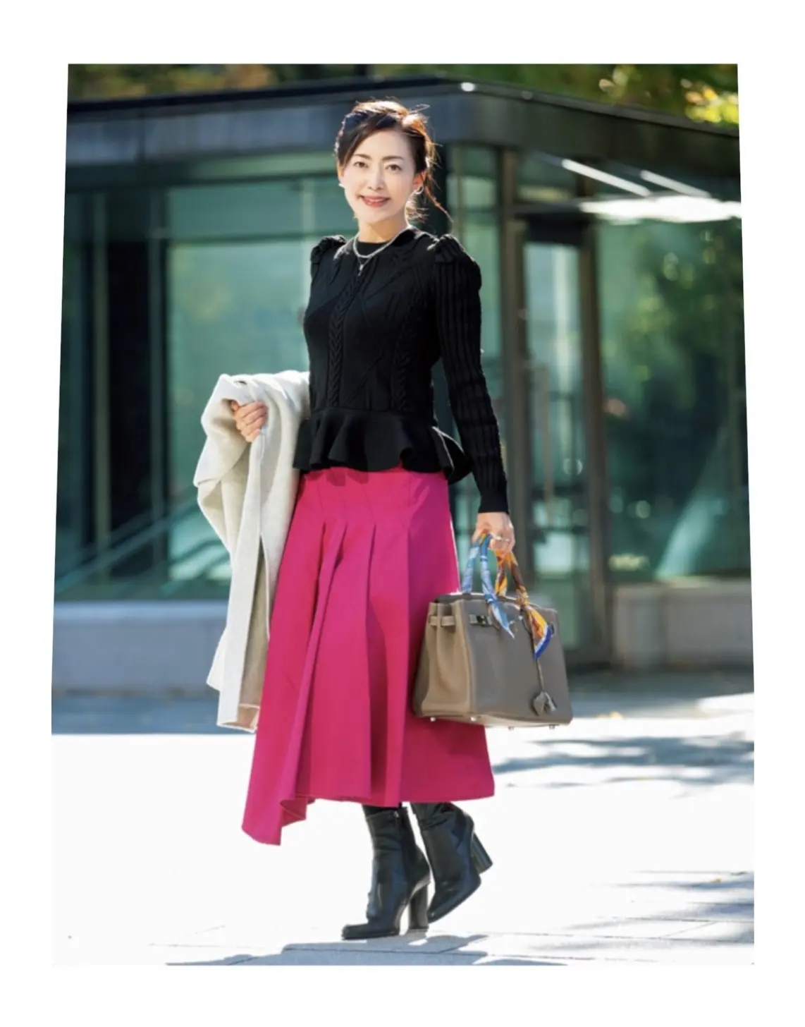 私はインパクトのあるスカートコーデ。数年前に購入したミラオーウェンのアシンメトリースカートに、今季購入したダブルスタンダードクロージングのヘプラムニットを合わせて。シルバーアクセサリーを取り入れる事で甘さを抑えたスタイルにしました。