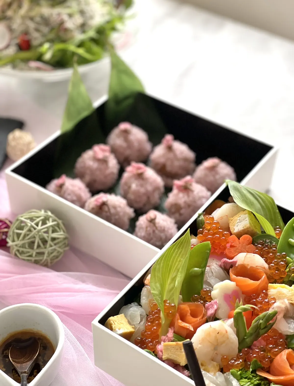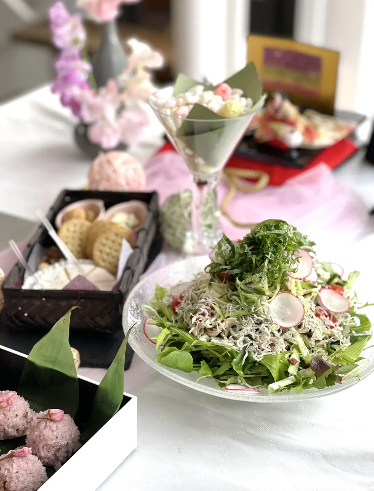 桃の花、スイトピーを花瓶に生け、重箱や取っておいた和菓子屋さんの籠などを使って和のテーブルにしていきます。