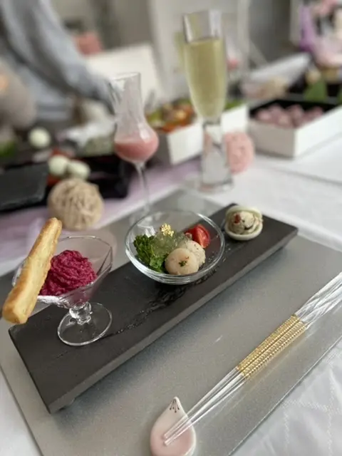 銘々のスペースにはシルバーの折敷を敷いて、前菜をのせる為の黒い角皿を。黒を入れると締まるのでバランスが良くなります。