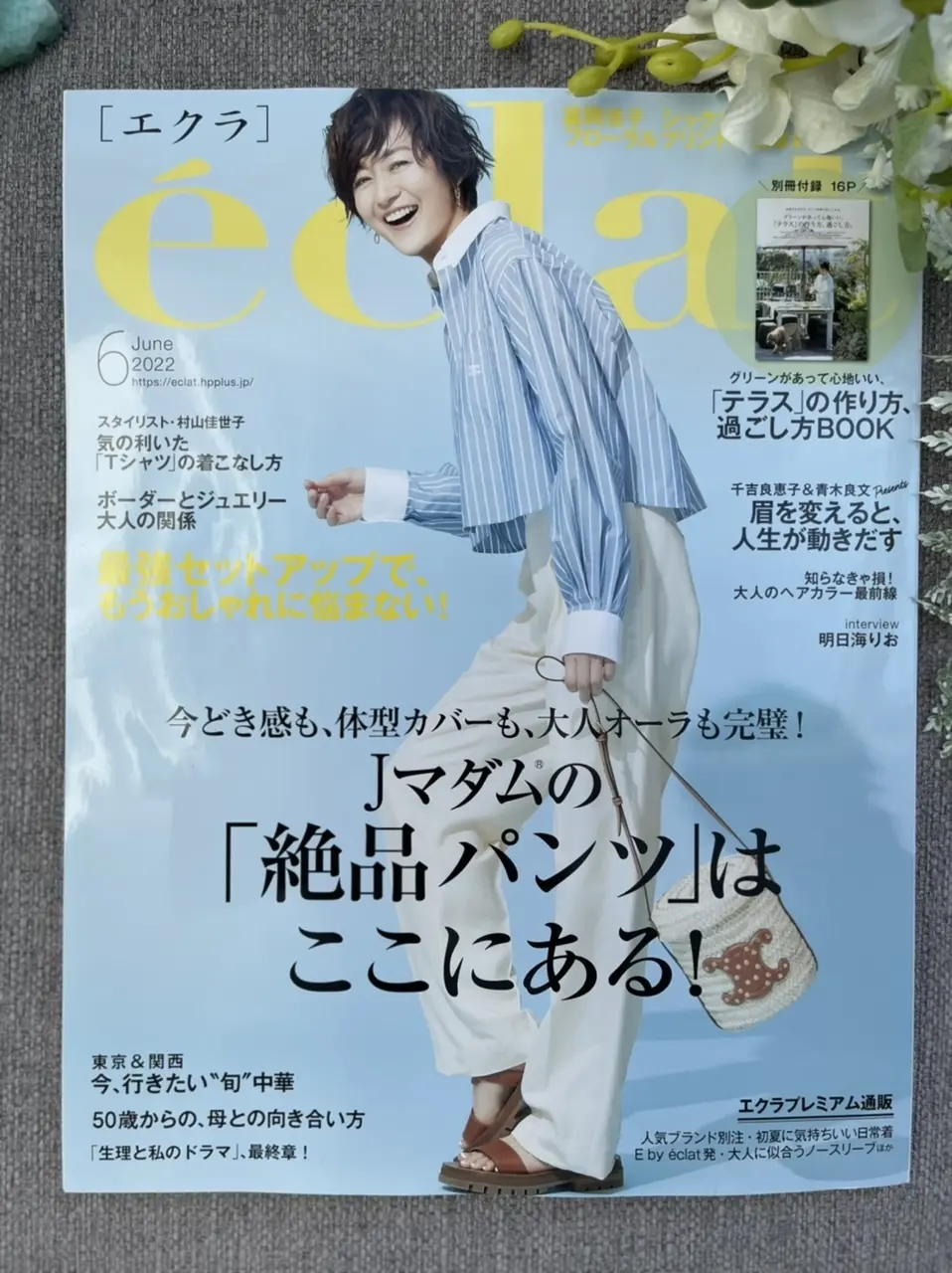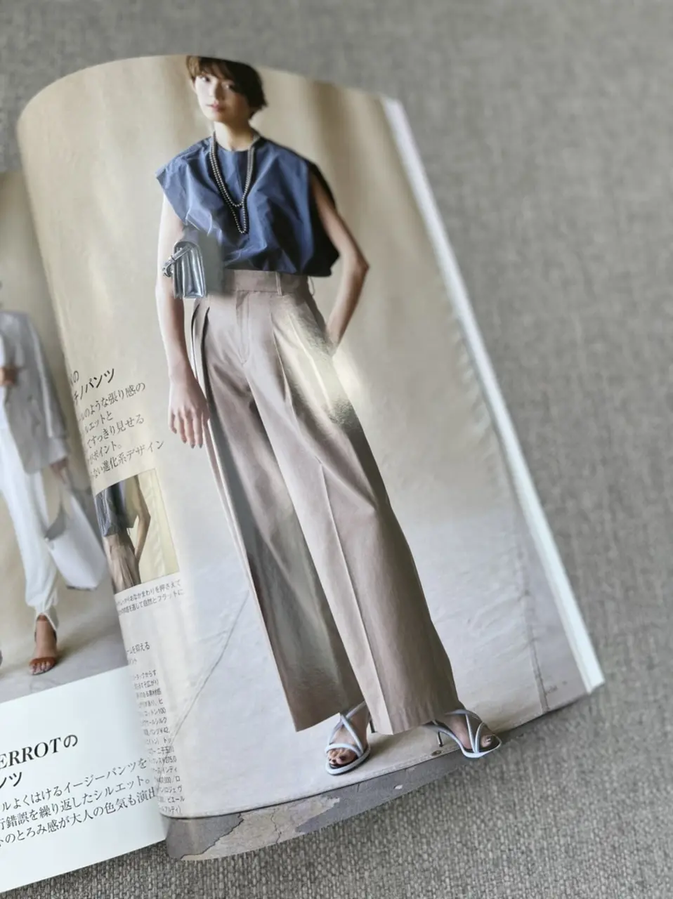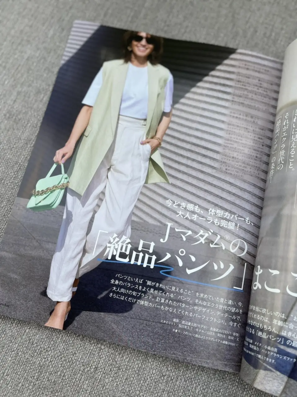 只今発売中の『エクラ6月号』の特集記事は「絶品パンツ」。モデルさんのカッコいい着こなしを羨望の眼差しで眺めながら、手持ちのパンツとジレで真似っこコーデしてみました😊