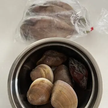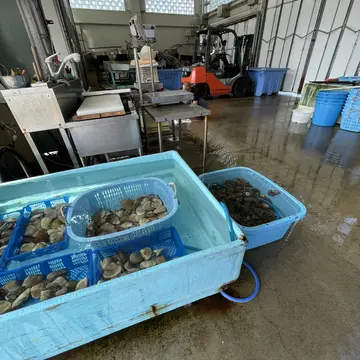 週末の朝は、獲れたての魚や魚介の直売をやっています。この日は大きなハマグリとアジの開きをGET!!