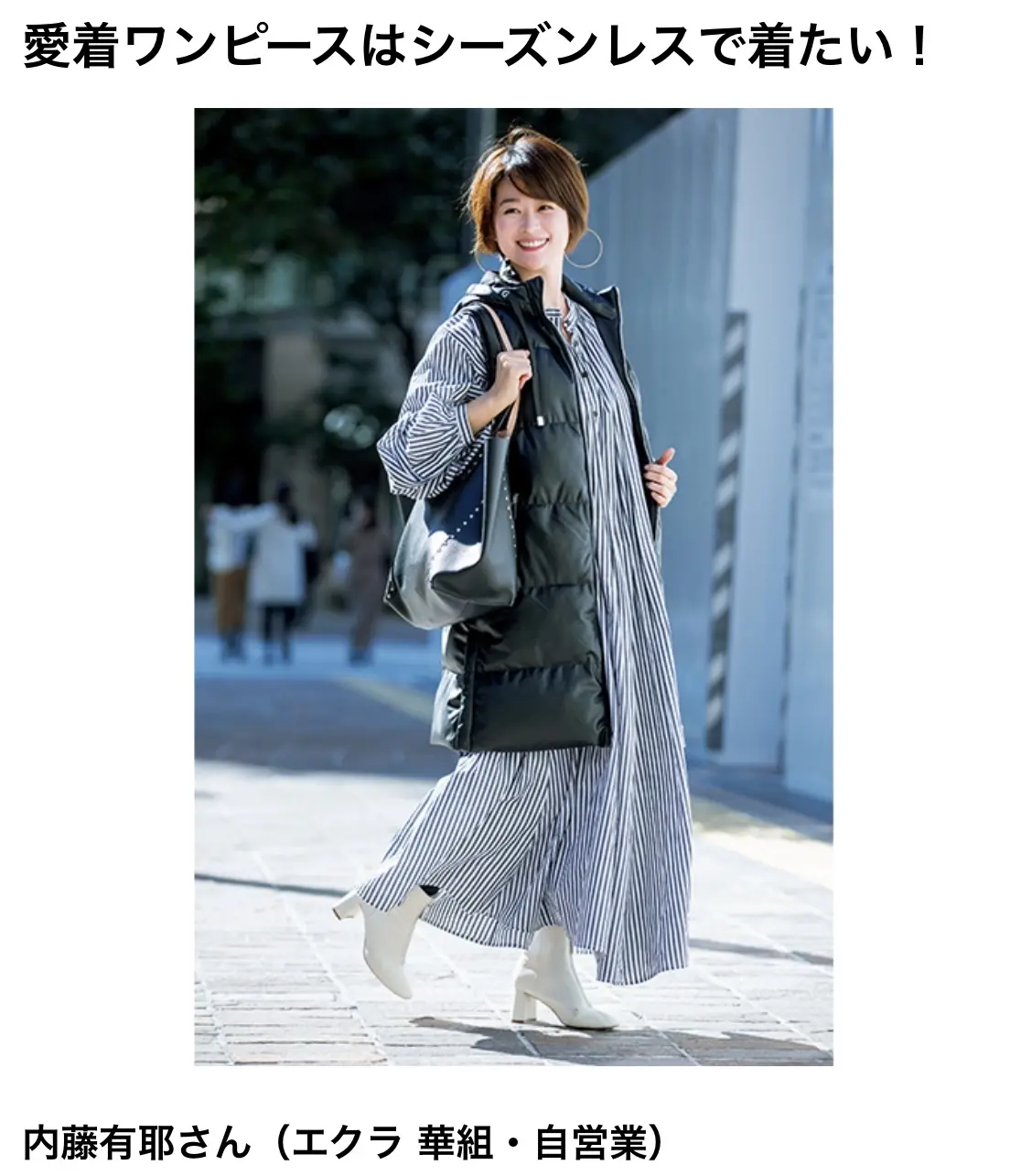 ちなみに撮影時は“ダウンベスト+ワンピース+タイツ”というコーデでしたが。