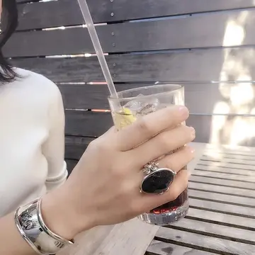 手元は南米ペルーのILARIAの指輪。石はlluvia de oro(金の雨)という名前の石で、紺色なのですが、石の中に雨のように小さな金が散りばめられています。土台のシルバーの細工も大好き。全く高価なものではないのですが、とても大切にしています。