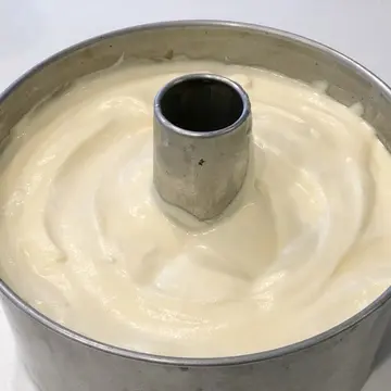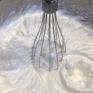 シフォンケーキのコツはただ一つ。下左写真のように、泡立て器が自立するくらいしっかり泡立てること。