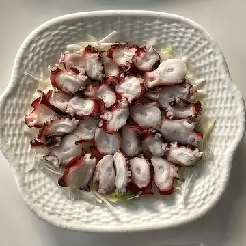 ②たこのお刺身用を薄切りし、①の上に載せます。