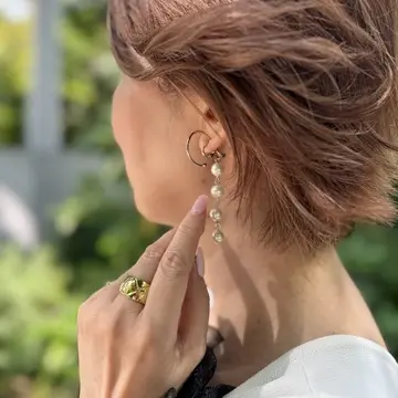 アクセサリーは、イヤリングは左右でアシンメトリーに。