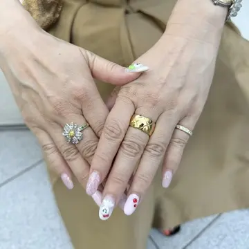 手元はインパクトあるネイルに、リングの重ねづけで賑やかな雰囲気になってます。