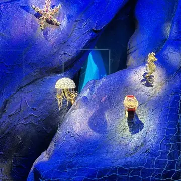 ジュエリーの魅せ方がまた素晴らしく、一枚の絵画に見立てたり、深海を覗いているかのような遊び心あふれる展示。