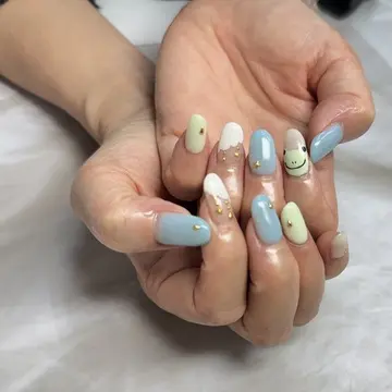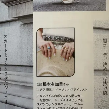 小物(帽子・かごバッグ・サンダル)はプリントの中の色を拾い、ターコイズのリングやネイルもスカートとリンクさせて、全体に統一感を持たせました。