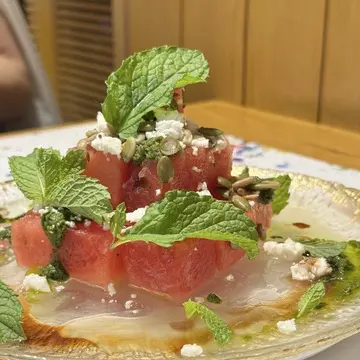 スイカを使った前菜とバーニャカウダは、見た目にも涼しげで夏らしい一品。