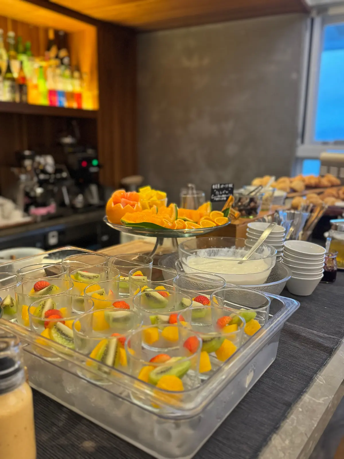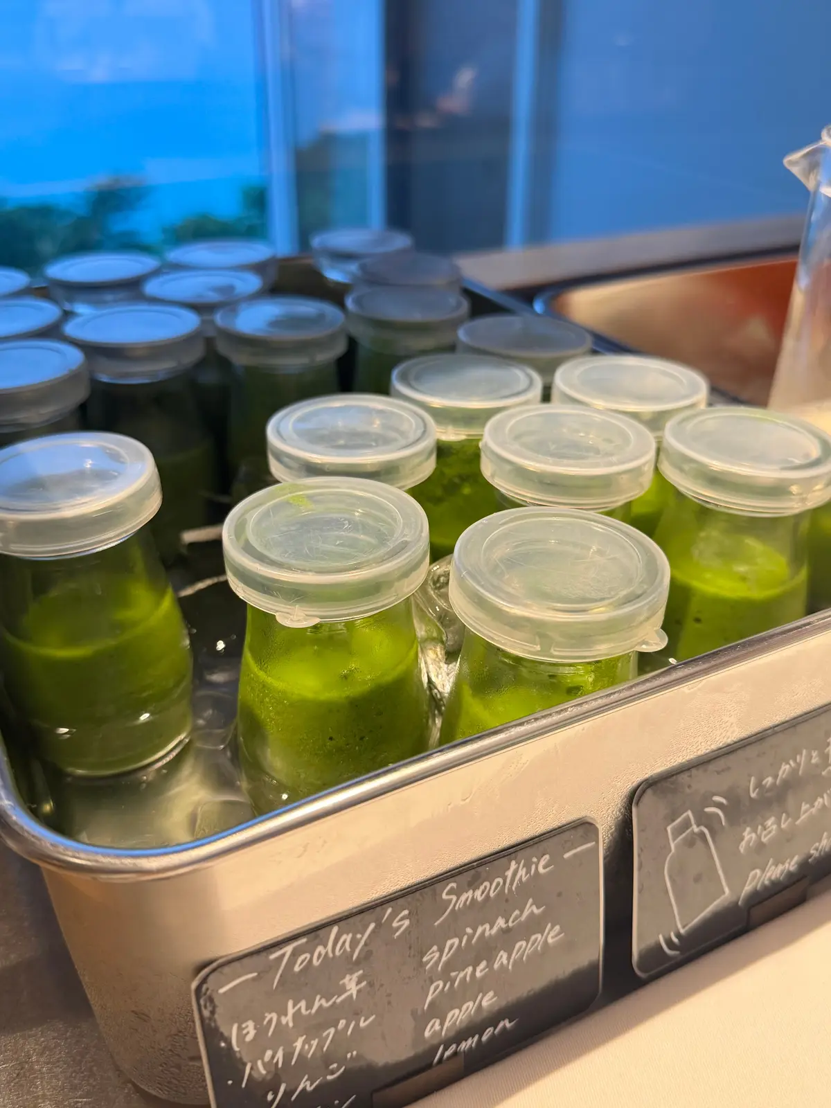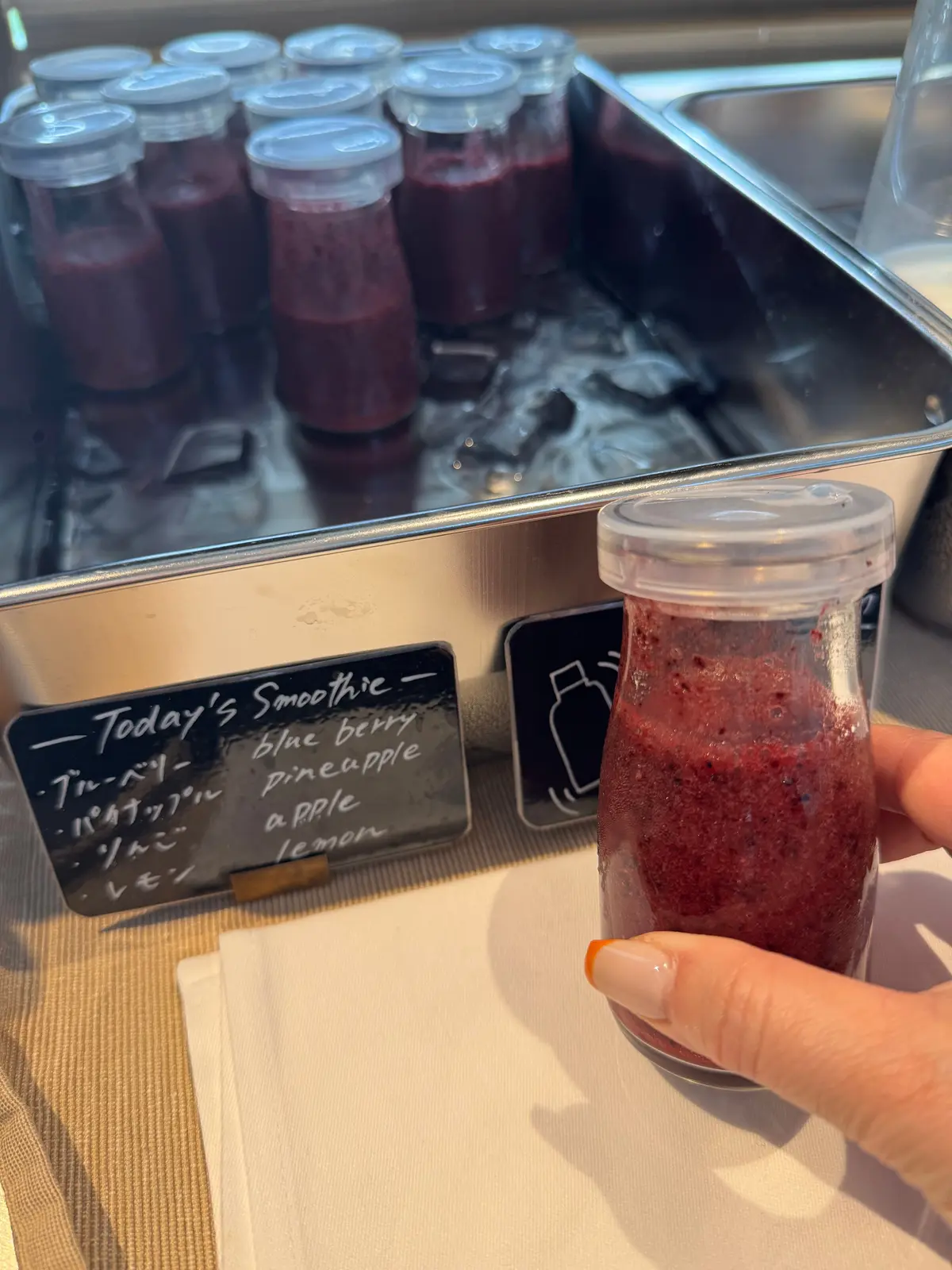 サラダやパン、フルーツ、ドリンクはビュッフェ形式で、スムージーも美味しく、朝の時間が楽しみに!