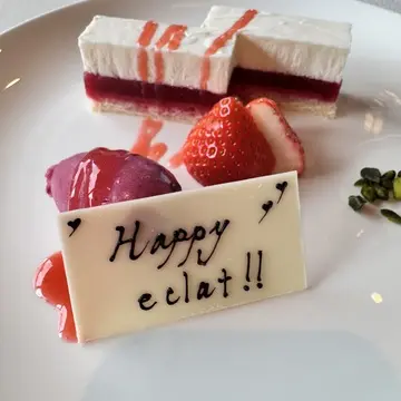ワインを頂きほろ酔い気分の中、最後に用意されたデザートには「Happy eclat!!」夫がオーダーしたようです。「ハッピーなエクラ」笑。ここは深く追及せずありがたく完食しました。