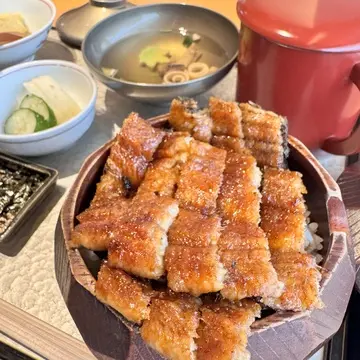 お櫃から飛び出るカリッと焼かれたふわふわの肉厚うなぎが贅沢〜♡