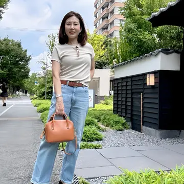 バッグとベルトはキャメルでカジュアルなものを合わせました。
