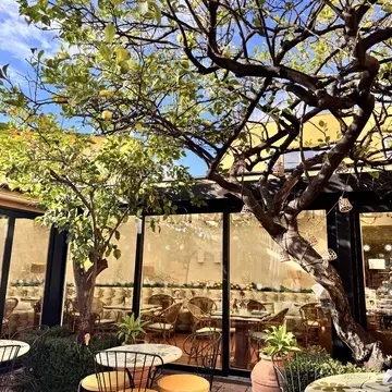 真っ青な空と冬なのに温かい気候、乾燥した空気に自然と一体となったレストラン環境。