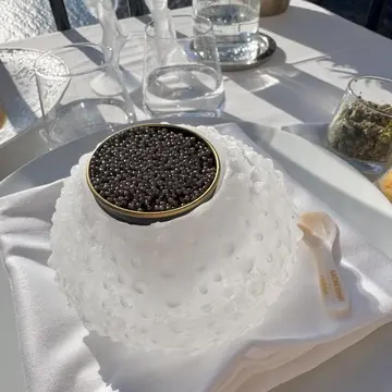このキャビアの器が氷そのもので形とられていてとっても素敵です。