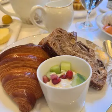 クロワッサンとナッツのパンは絶品でした。フムスをのせて