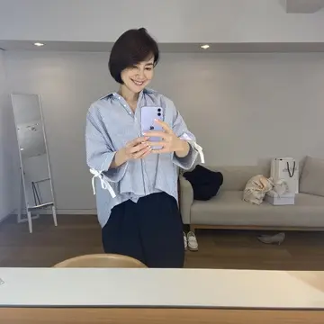 この日は袖口のリボンがポイントのストライプシャツとネイビーのタックパンツで(アトリエエヌズ)