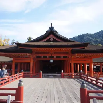世界文化遺産「厳島神社」 美しい朱塗りの社殿は潮が満ちてくると海に浮かんでいるような不思議な建築美をたたえています。