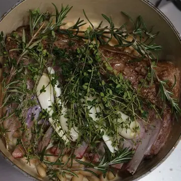 ココットに白インゲン豆とコップ1杯の水を入れ、フライパンで焼き目をつけた仔羊、エシャロット、ローズマリー、タイムをのせ、オーブンへ