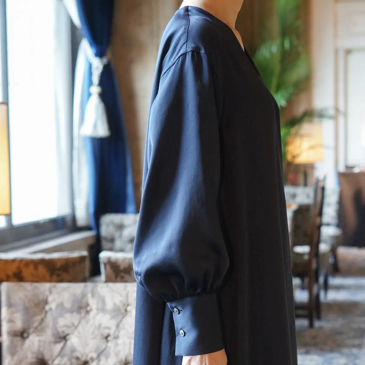 ゆったりとしたシルエットと光沢感のあるサテン素材のワンピースには、袖回りと切り替えにギャザーがたっぷりと入っています。