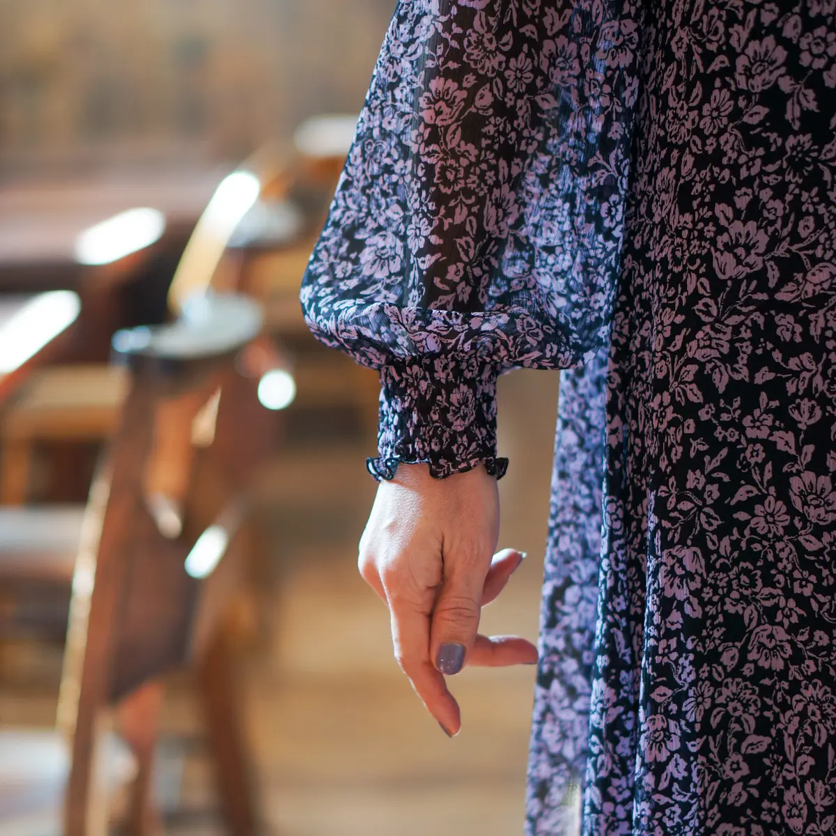 シアー素材を使用した華やかなフラワープリント。この日はチョコブラウンのボトルネックニットを合わせました。
