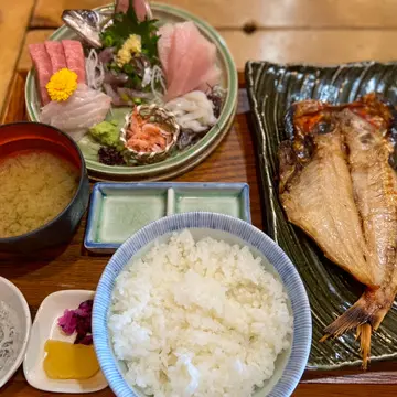 「金目鯛の干物とお刺身の定食」 お刺身がどれも新鮮で美味しい! 干物もちょうど良い塩加減でした♪