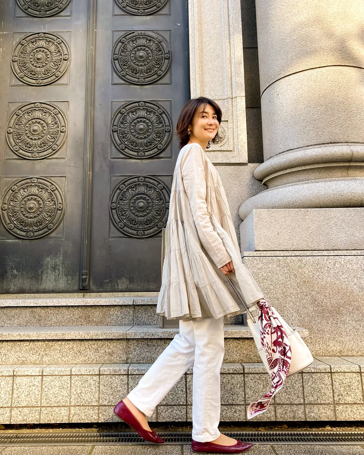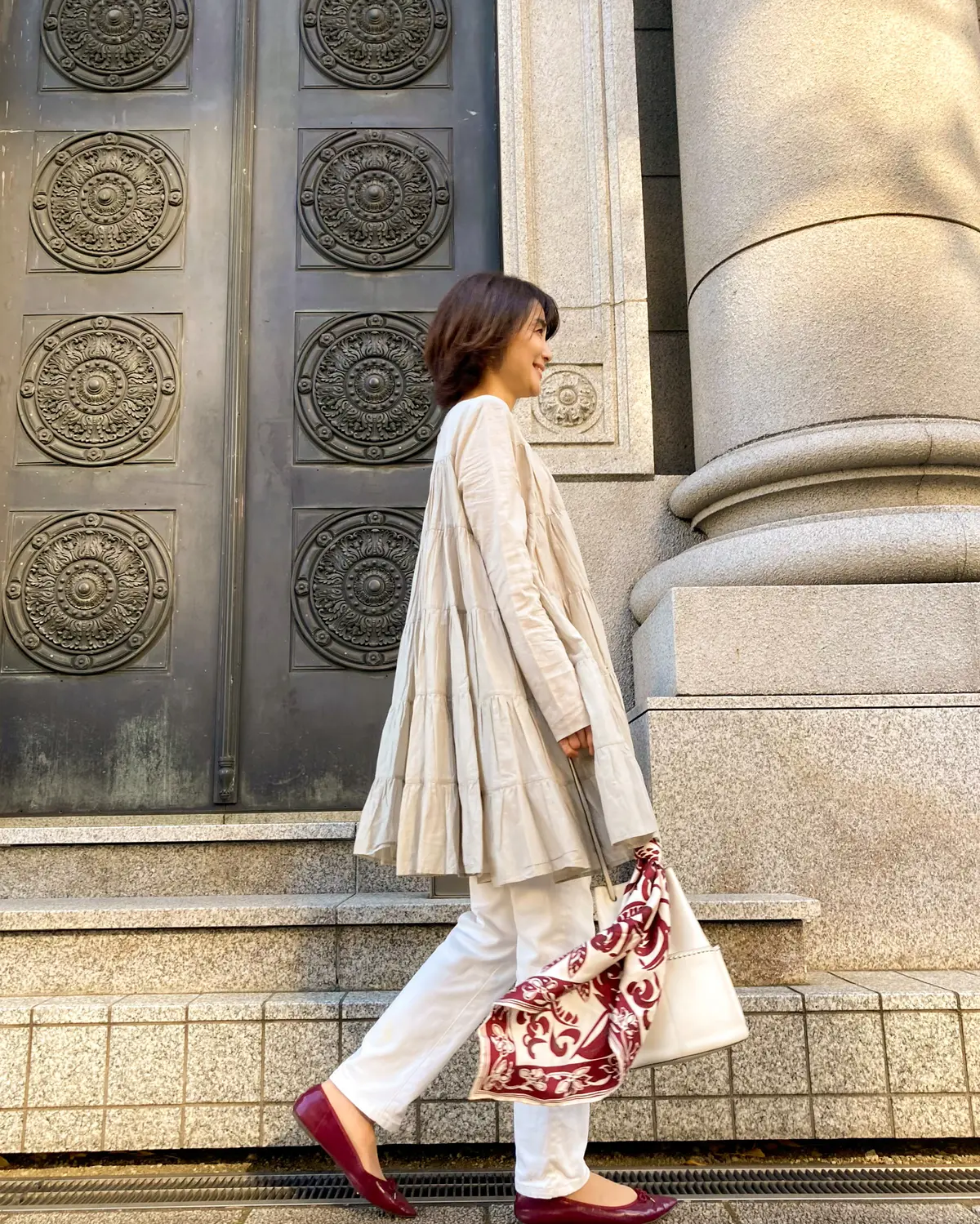 この日は「Merlette」のティアードワンピースに「UNIQLO」の白デニムをレイヤード。