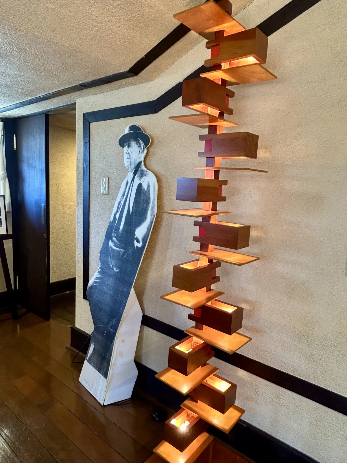 右の写真は大谷石とライトの絵の前で記念の1枚。一人だったのでセルフィです。