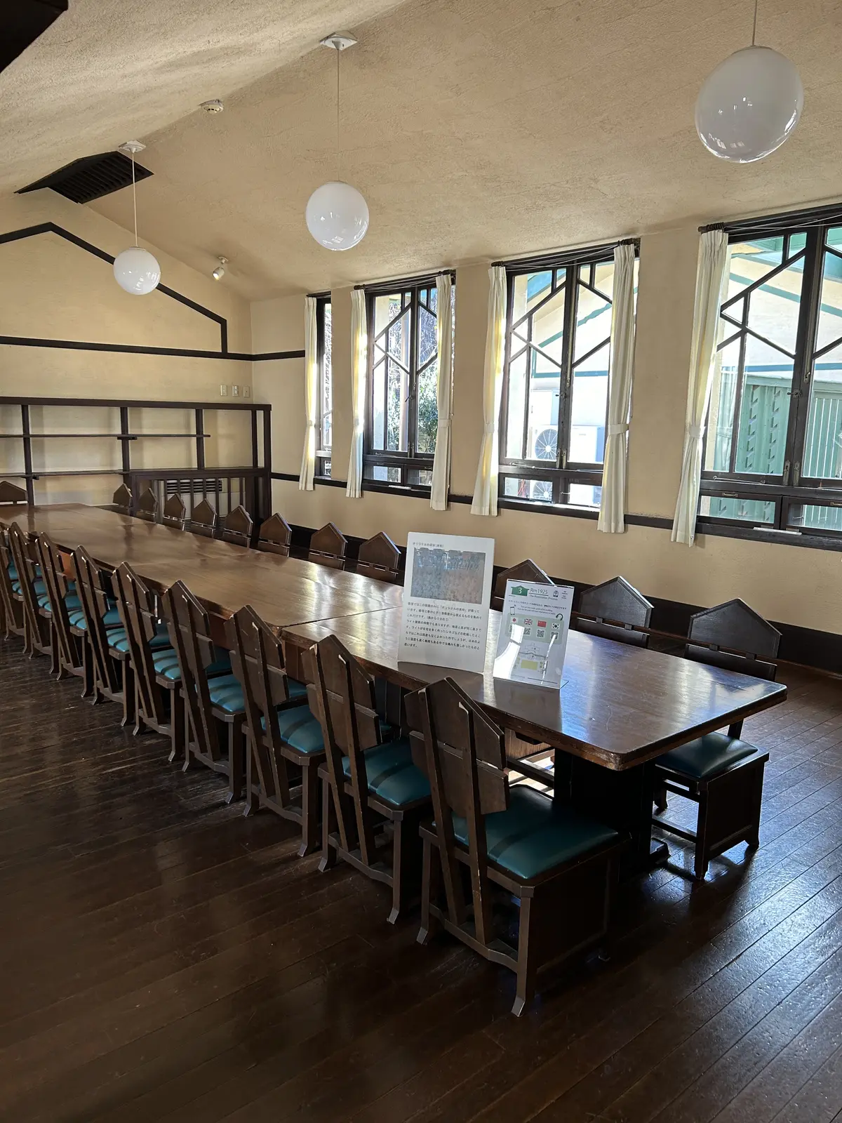 磨き込まれた木の床と黒板が懐かしい。女学校として使われていた当時(大正10年~昭和9年)は照明はなかったみたいです。雨の日などは、暗かったでしょうね。