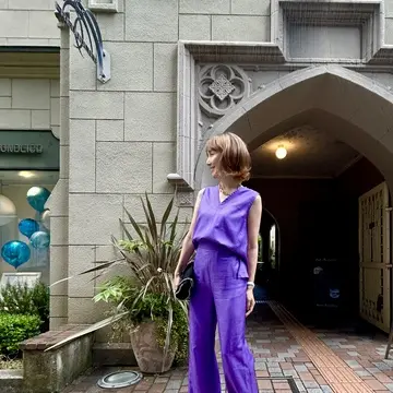 この日の私は紫色のパンツスタイル。落ち着いたパープルが、古い建物ならではの質感や装飾など独特の雰囲気に合っているように感じました。